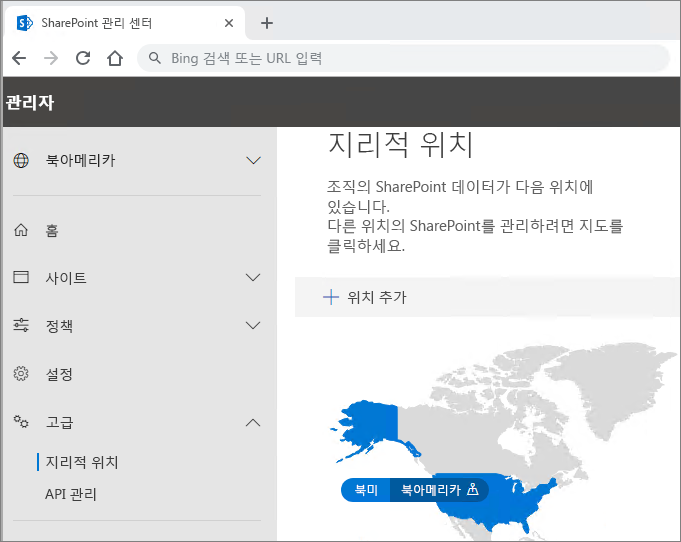 OneDrive 및 SharePoint 관리 센터에서 지리적 위치 탭을 사용할 수 있게 됩니다. (아래)